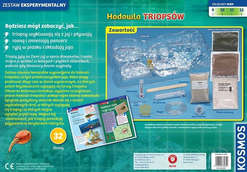 Odkryj prehistoryczny świat z Hodowlą Triopsów od Piatnik! Te niezwykłe stworzenia, które przetrwały od czasów dinozaurów, możesz teraz hodować w domu. Zestaw zawiera jaja triopsów, zbiornik z dwiema strefami, lupę oraz kolorową instrukcję, która krok po kroku wprowadzi Cię w proces hodowli.