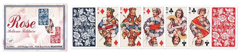 Dwie talie w mniejszym formacie, by łatwiej było układać pasjansa. Na rewersach (koszulkach) interesujący motyw kwiatów alpejskich. Awersy Środkowoeuropejskie.