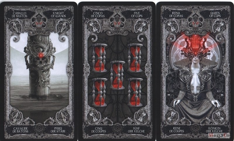 Talia kart do tarota utrzymana w mrocznej konwencji, która wprowadzi cię w mroczną krainę. Karty przedstawiają czarno-białe ilustracje z elementami krwistej czerwieni, które jeszcze bardziej podkreślają mroczny klimat talii. W talii znajduje się 78 kart o wymiarach 110 x 60 mm. Instrukcja w języku min. angielskim, niemieckim i hiszpańskim. - brak instrukcji w polskim języku.